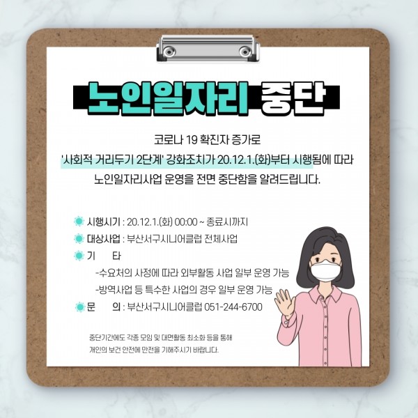 코로나 19 대응 사회적거리두기 2단계 시행에 따른 노인일자리사업 중단안내(2020.12.01.)